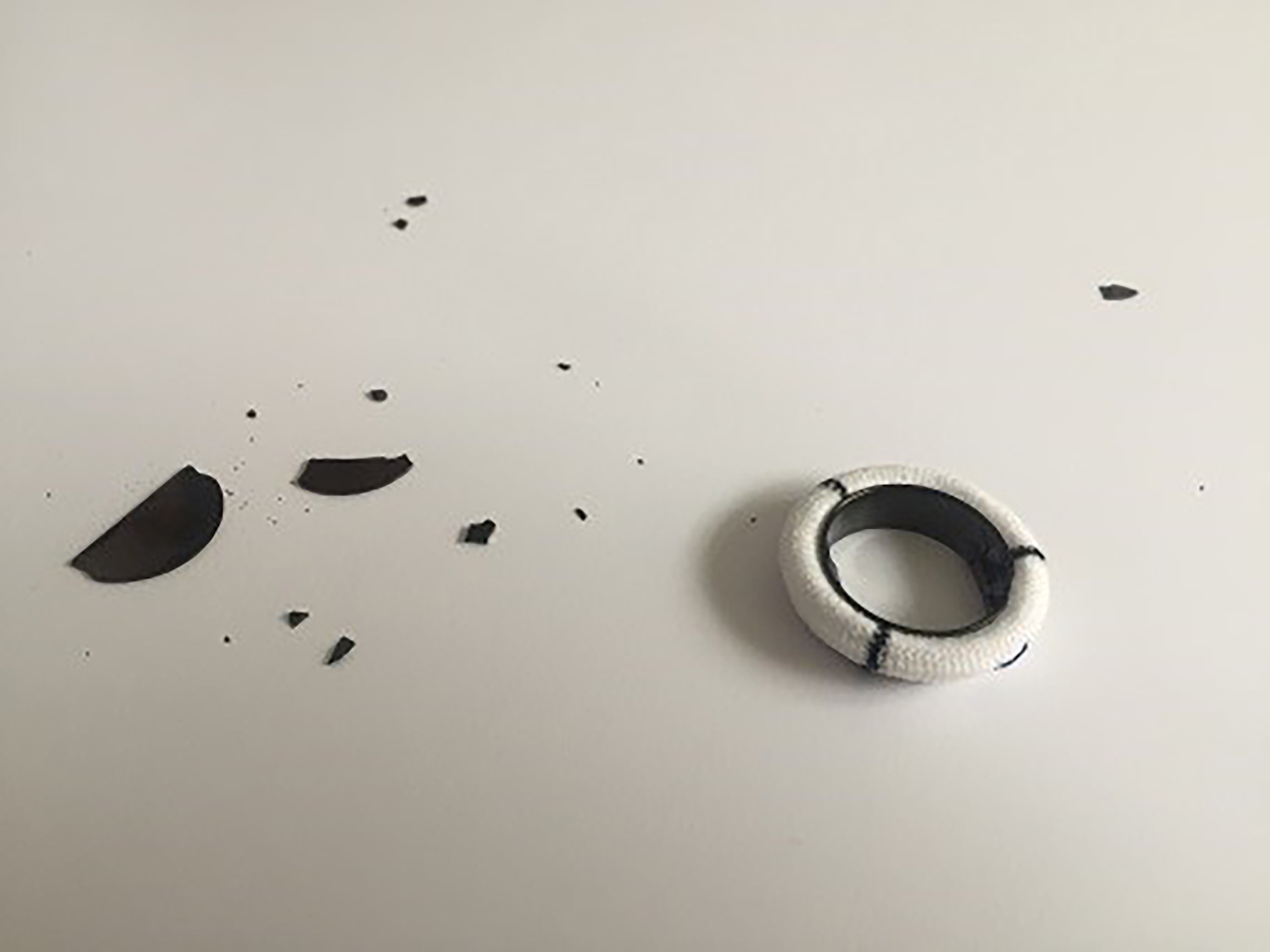 Der Ring einer mechanischen Herzklappe nach der Sprengung des Carbon-Flügels im vorklinischen Labortest.