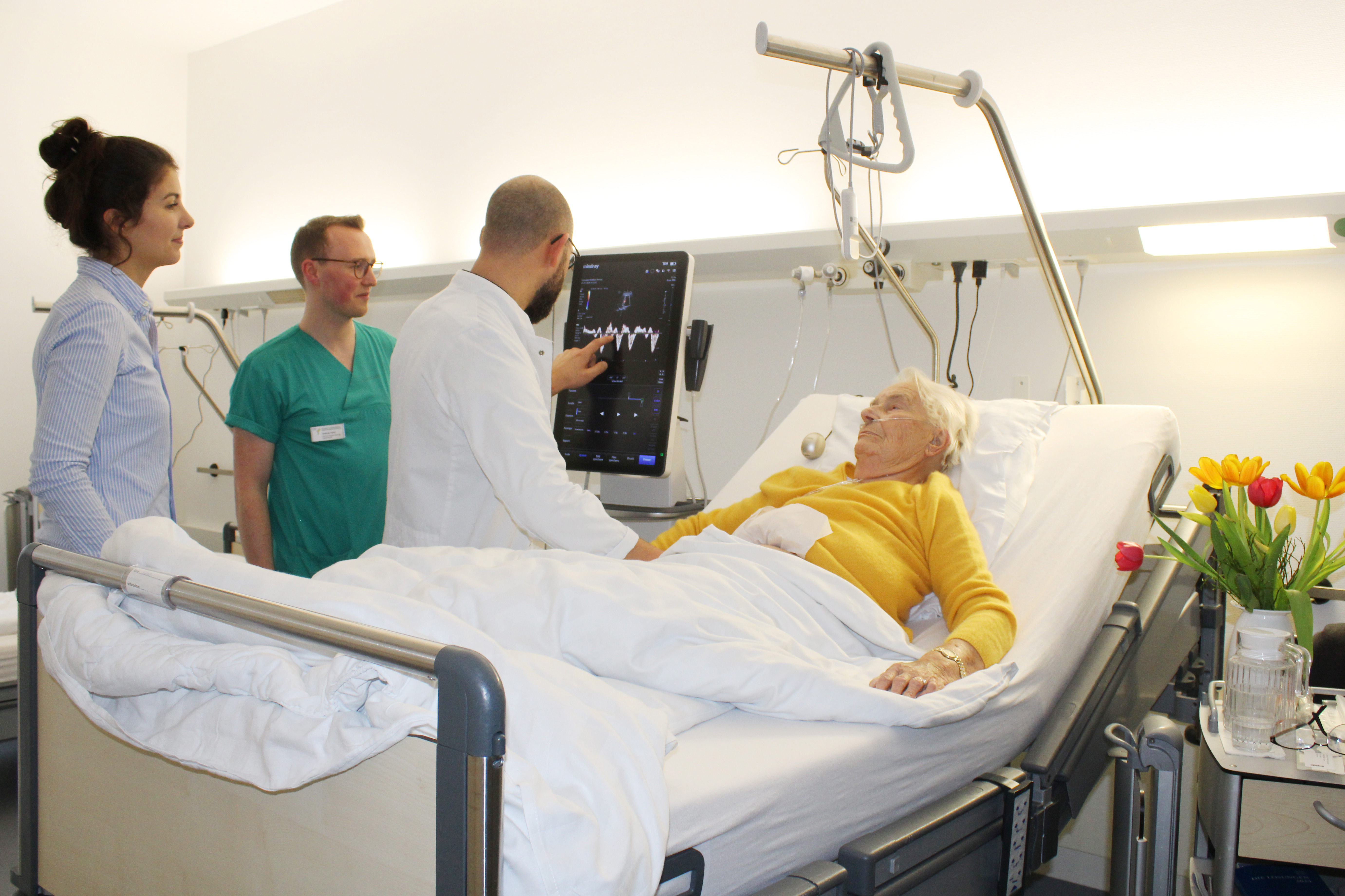 Pressefoto: 2024-02-23 MHB-Studentin Charlotte Du Chesne, Arzt in Weiterbildung Jonathan Nübel und MHB-Student Simon Seitz (von links) testen mit Patientin Ingrid Duve die neue Methode für die Studie (JPG, 4 MB)